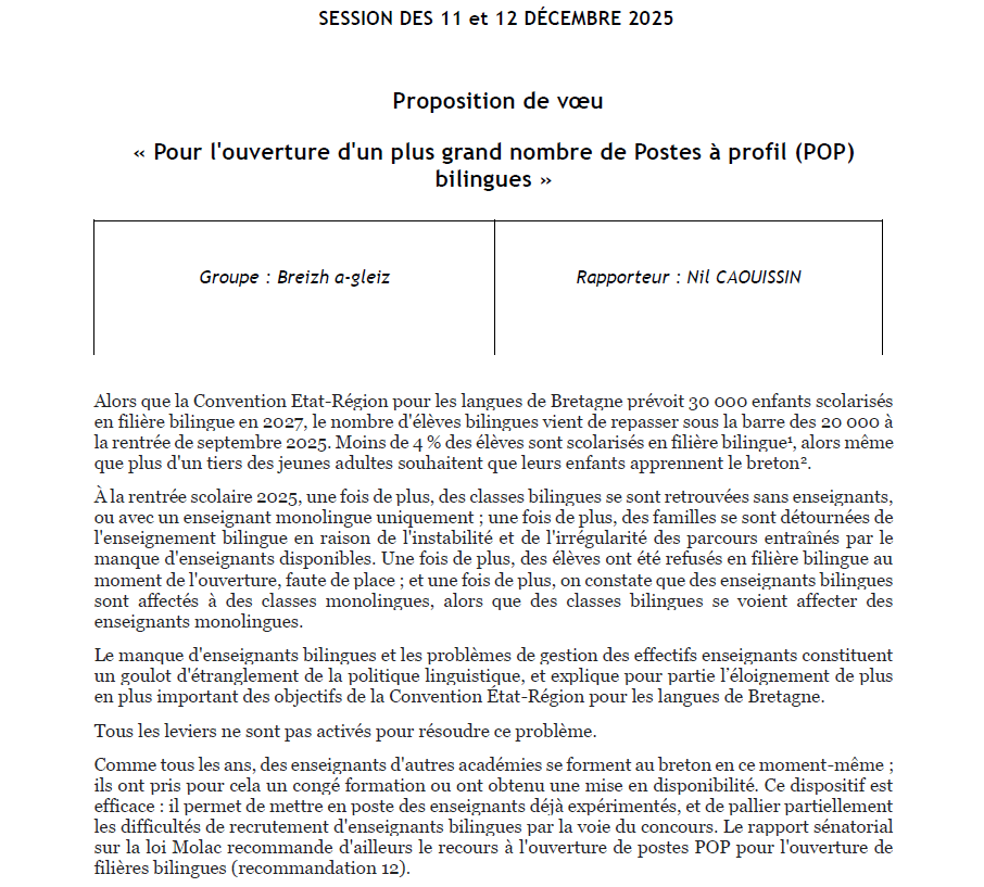 Prezegenn distaget d’ar yaou 11 a viz kerzu 2025, e Kuzul-rannvro Breizh. Votet eo bet an destenn.