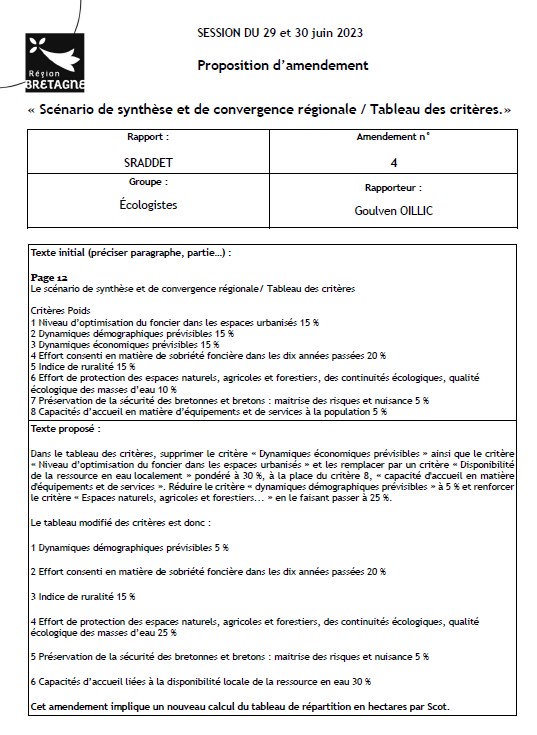 Ci-dessous: l’amendement proposé par Goulven Oillic, collègue conseiller régional du groupe Ecologistes. Amendement rejeté par la majorité.