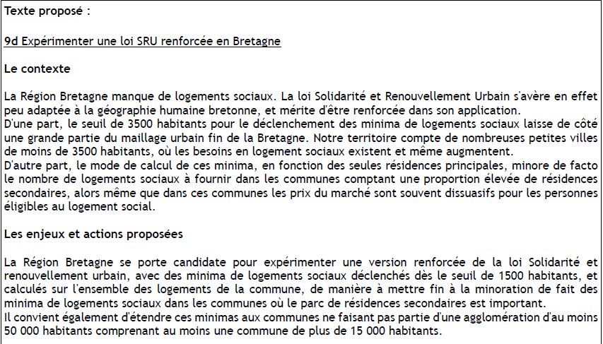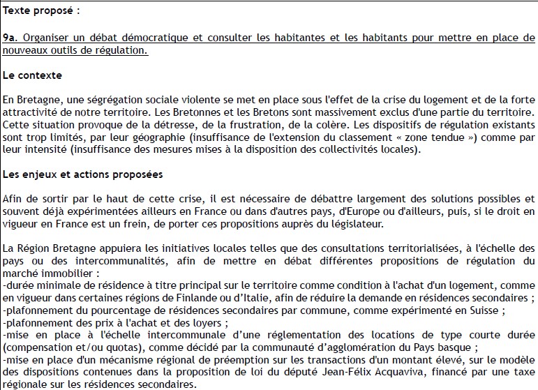 Kinnig a reomp da gentañ ober eus rannvro Breizh un tiriad arnodiñ ostilhoù-reolenniñ nevez, pe a reoù a vez lakaet e pleustr e broioù all dija. Kinnig a reomp o lakaat e breud e-touez annezidi pep tiriad e Breizh. Kinnig a reomp adlakaat war-wel mennozh un taos rannvroel war an eil-tiez, ur mennozh difennet gant rannvro Breizh abaoe 2019, hag a vefe deuet mat hiziv. Kinnig a reomp c’hoazh arnodiñ ul lezenn KAK kreñvaet evit broudañ diorren al lojeiz sokial e pep lec’h e Breizh.
